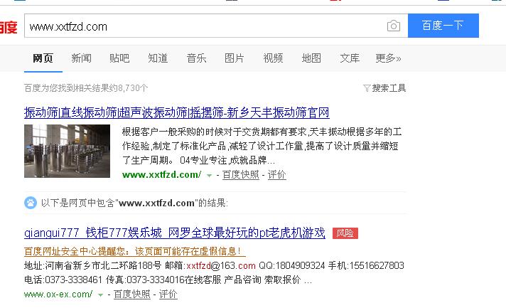 第二條信息,下面的地址,郵箱啊等等資料都是我們新鄉(xiāng)市天豐振動機械公司的,但是打開內(nèi)容,卻是一個很不的網(wǎng)站,我查看了一下源代碼,沒有我們公司的,這是什么情況呢,然后我又看百度快照信息,結(jié)果如下: